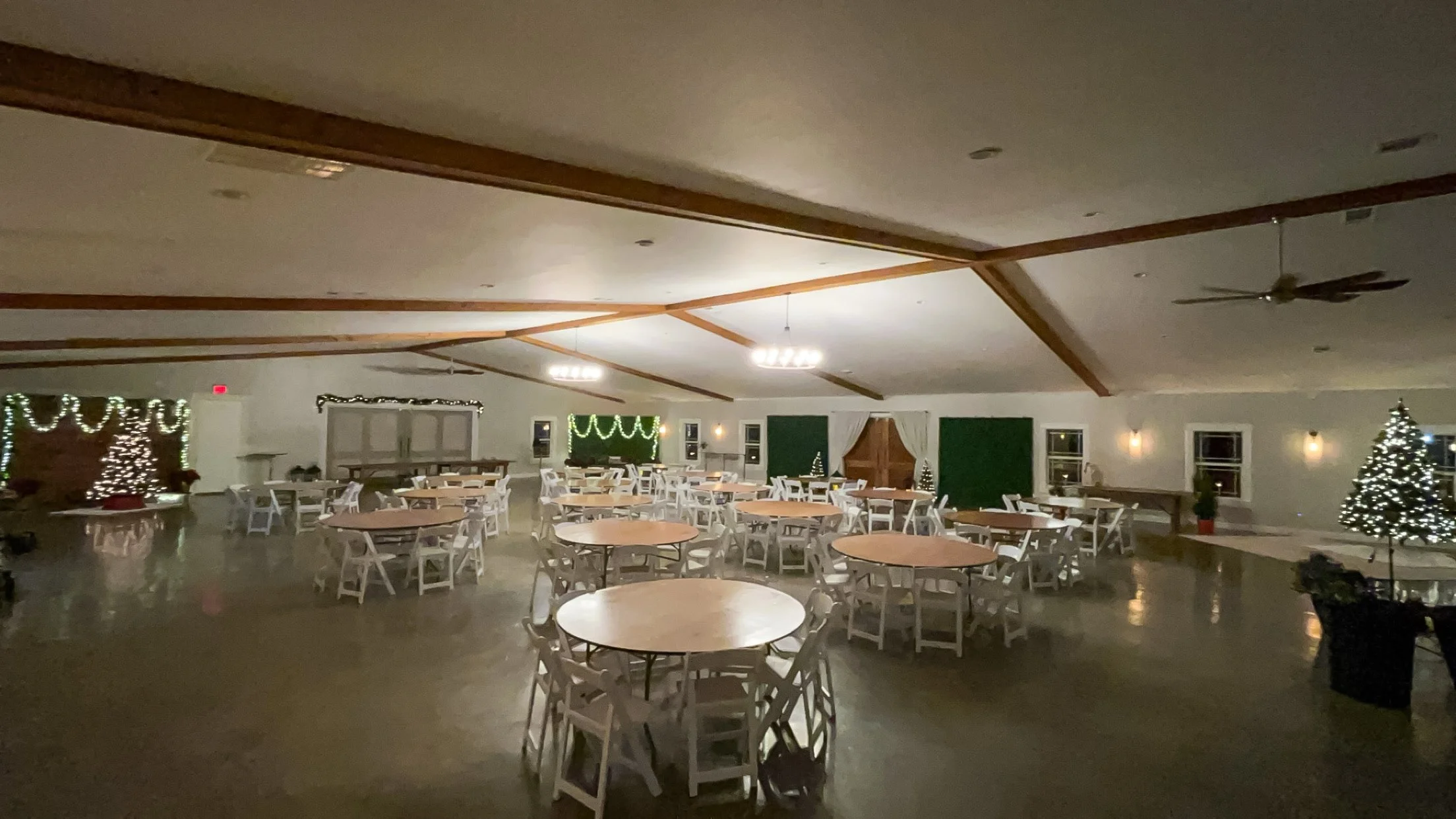 Enhancing your experience, amenities include a full prep kitchen to simplify catering and food preparation, tables and chairs, a distinct bridal and groom room, and separate men’s and women’s restrooms, each with three stalls. The event space is climate-controlled with heating and air conditioning for your comfort year-round. For meetings or corporate gatherings, we also offer a large screen TV with HDMI input—perfect for presentations.